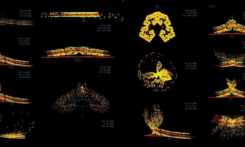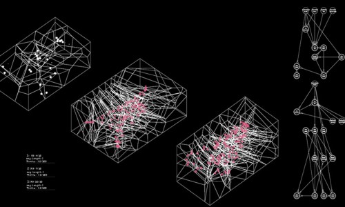 Once the parametric settings are established, the system is placed on site (figure 05), and the system interacts with the environment by responsiveness to the local pedestrian tensions. In order to reach the equilibruium shown, three different force fields were introduced based on the independent forces and directions. As a result, a Control point acts in a flexible manner towards pedestrian tensions generating a particular morphology as shown in figure 0.5. Variations in density were achieved through changes in the recursion depth variable of the Tree System.