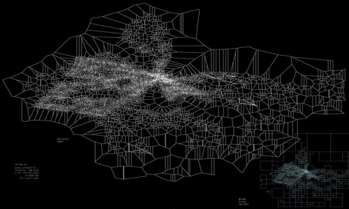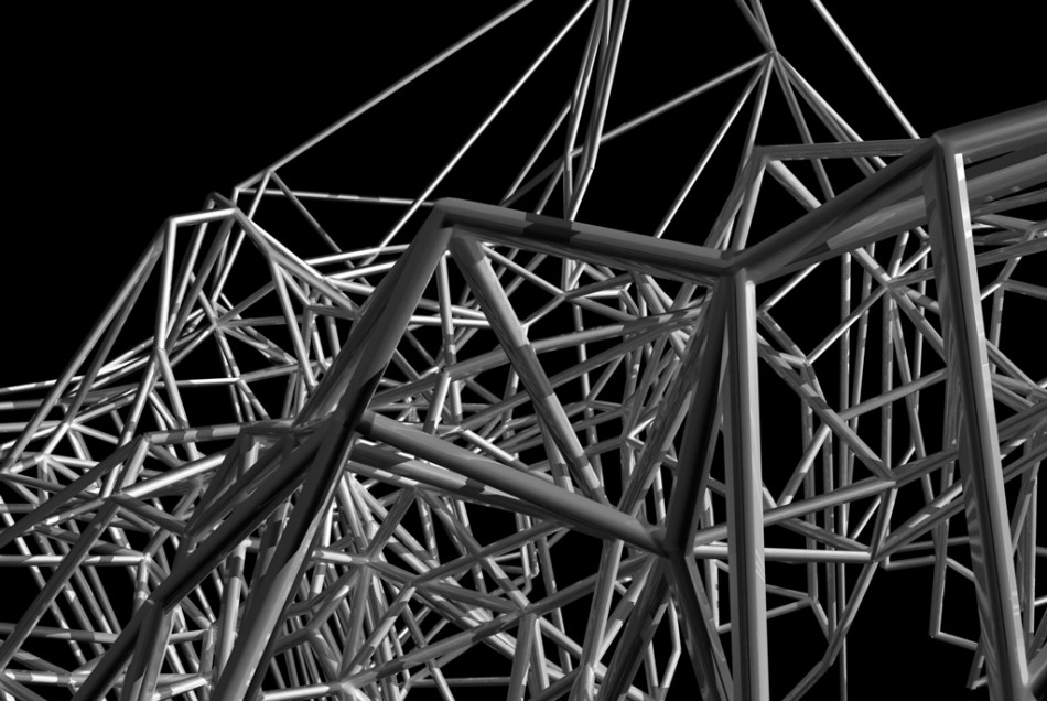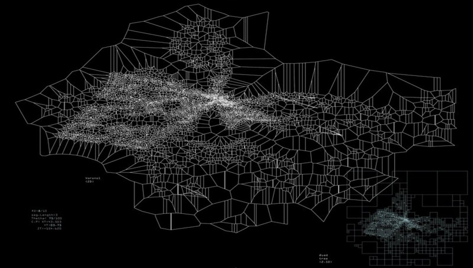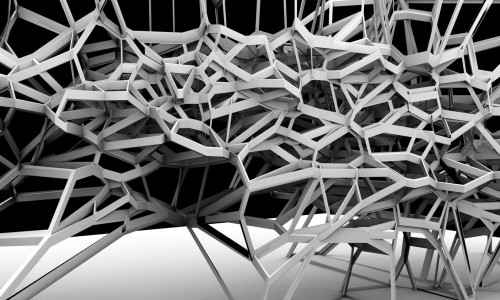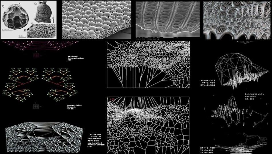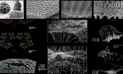 Digital form-finding processes were used to investigate possible structures and their spatial distributions. For instance Voronoi diagrams help to understand relations between components in their eighth stage of growth, as well as gradual morphological changes, e.g. from figure 0.2 to 0.4, geometrical symmetry has been broken. Differentiation is achieved through variations in the distance between intersections (points) and applied forces.