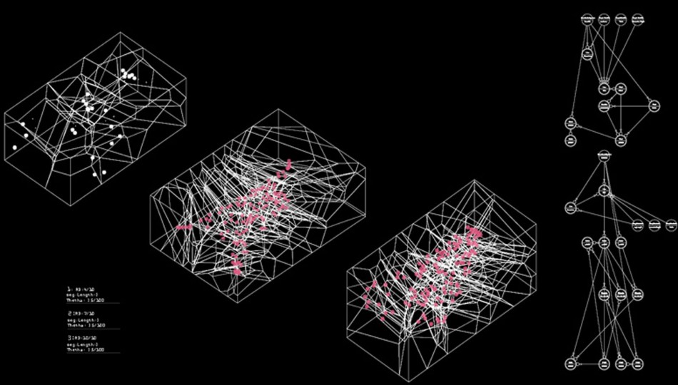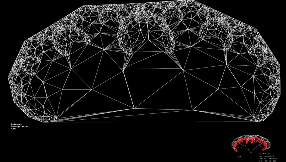 As well as examining the growth algorithm in order to represent architecture as an organism, the system included physical processes as driving factors in the generation of form, which then led to differentiation. In the context of “Morphogenesis”, the form did not emerge from the pure code (the genetic algorithm – tree system) but obeyed external forces that interacted with it, taken as environmental factors.