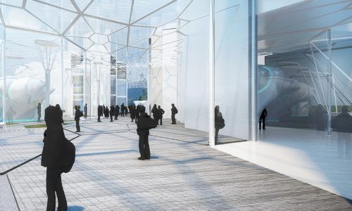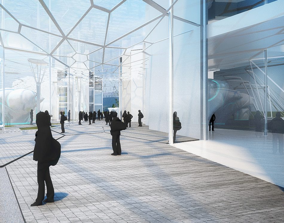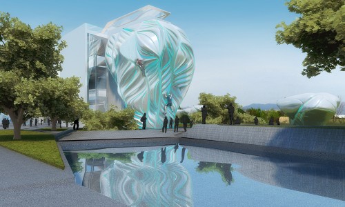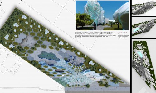 Our proposed Collider Activity Center is generated in a hexagonal forcefield from which park and buildings emerge as a result of requisite collisions between program activities. Project morphology is continually expanding and contracting in catalyzing the various hosted activities: it enables convergence at the Center Hall attractor point and subsequent expansion toward park and landscape. Systematic differentiation in the hexagonal modules drives a density increase toward Center Hall, from where buildings emerge, and subsequently a gradual decrease toward the park and Ropetopia, thus generating a wide grid for open space structures such as the Stage and Pool.