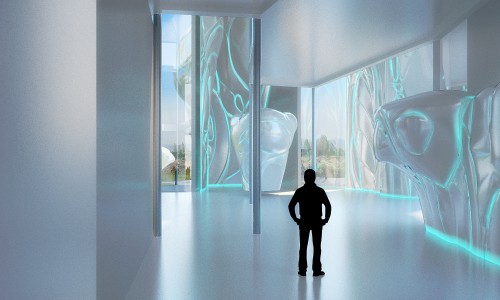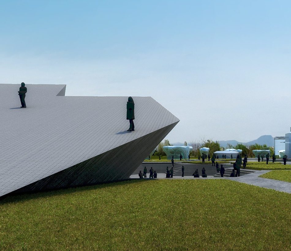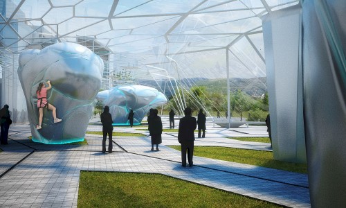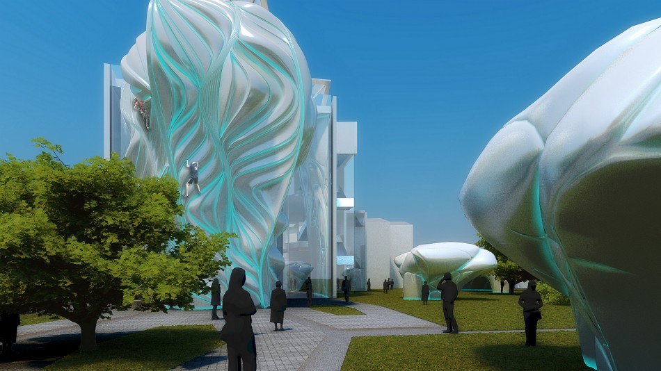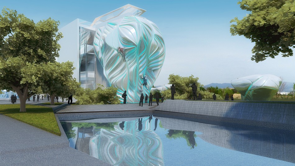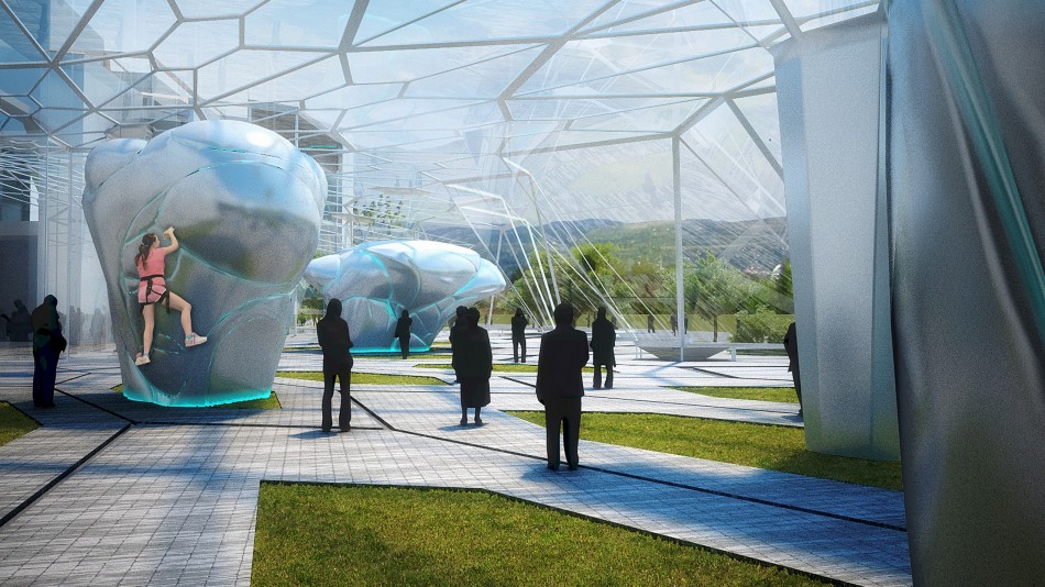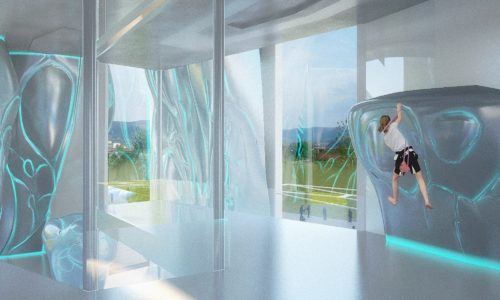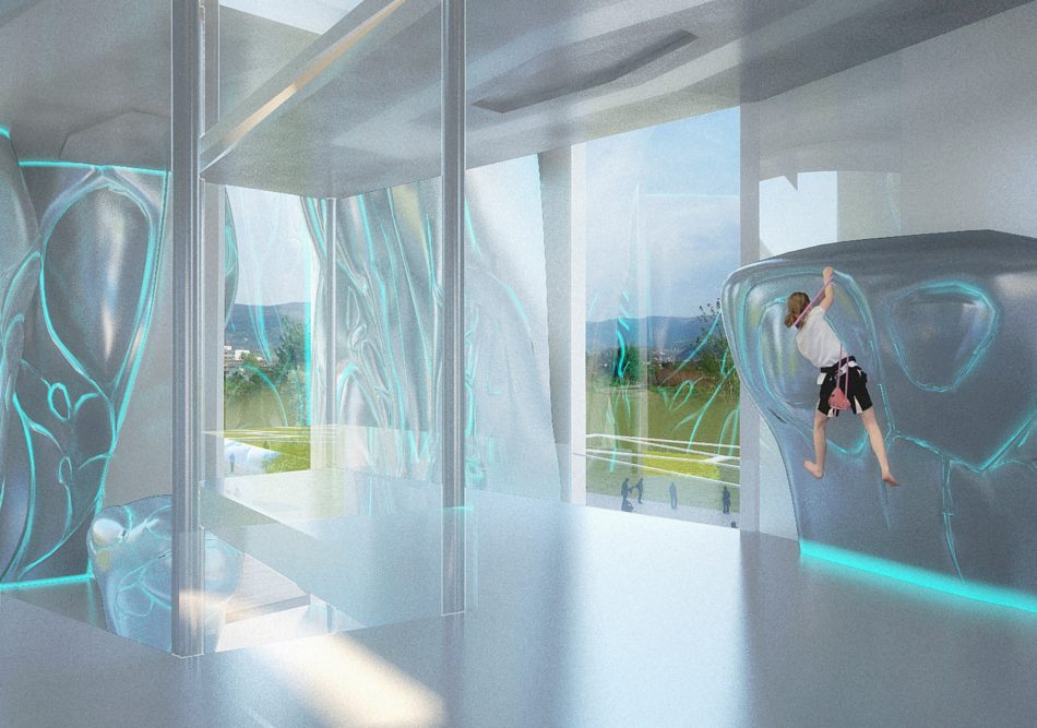 The complex consists of three volumes embedded in a central membrane, a lightweight structure that functions as a Greenhouse in winter as well as a roof for Center Hall, mediating public space between site, park, and buildings. In the first building are the climbing walls, bouldering area, and roof bar terraces which are strategically located to allow viewing of climbers and Vitosha Peak. The second building houses the Funtopia. The third hosts a spa and fitness center on the first floor, a multi-functional recreation center on the second, and administration offices on the third.