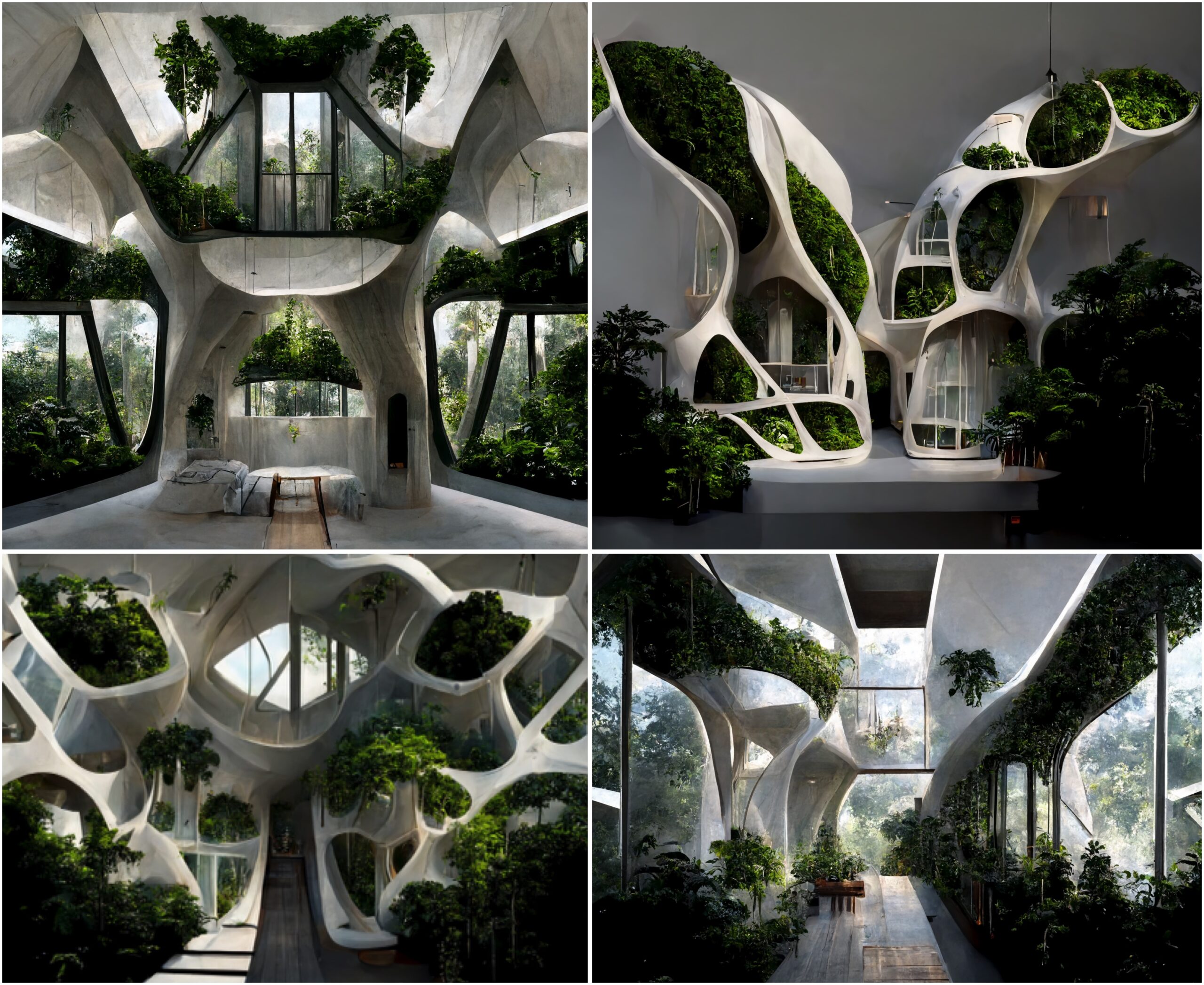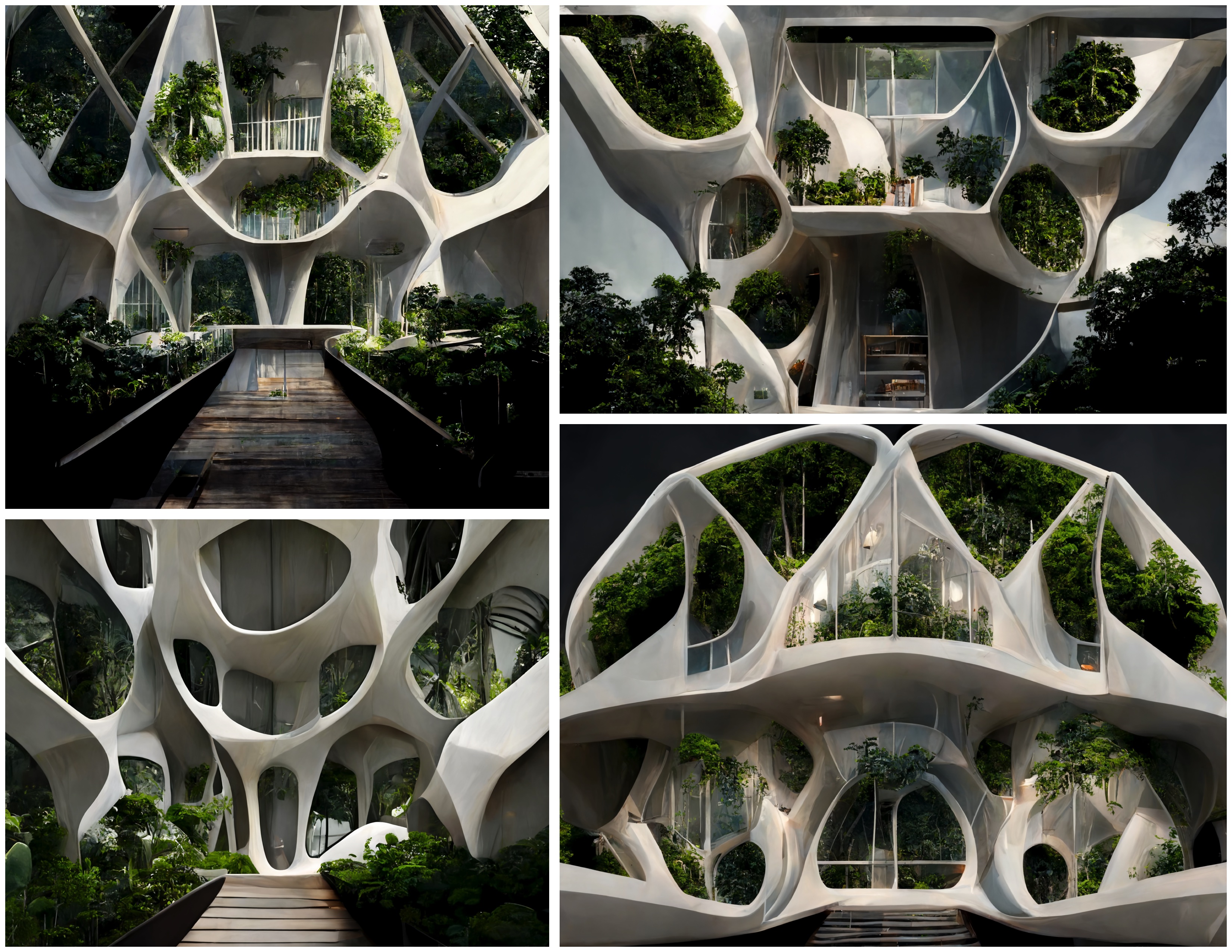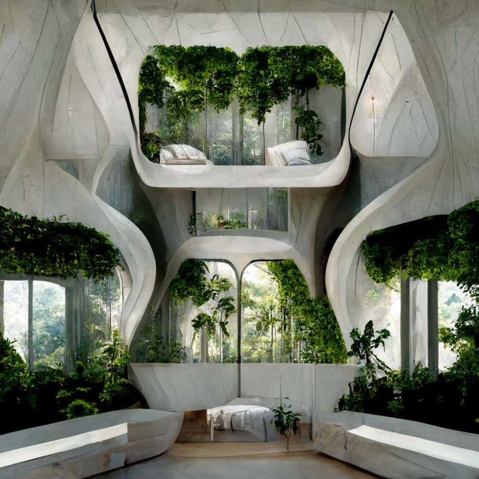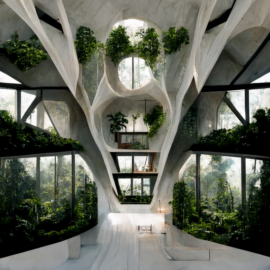 The sketches embark on an architectural exploration of residential buildings, leveraging the capabilities of Midjourney AI. This endeavor seeks to reconceptualize the application of biomaterials such as Mycelium (a special blend of mushroom roots and crop waste, that could grow and self-assemble in 3D-printed PLA molds), transforming it, from a mere structural element, to a multifaceted platform capable of sustaining food gardens. The initiative aspires to craft an integrated ecosystem, intertwining built environments with sustainable agricultural practices to forge a symbiotic relationship between structure and nature.